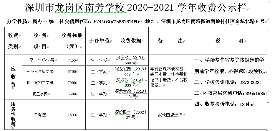 2020年至2021学年秋季收费公示栏